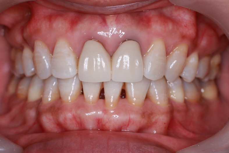前歯2本はセラミック歯が入っていますので変色せず白いままです。